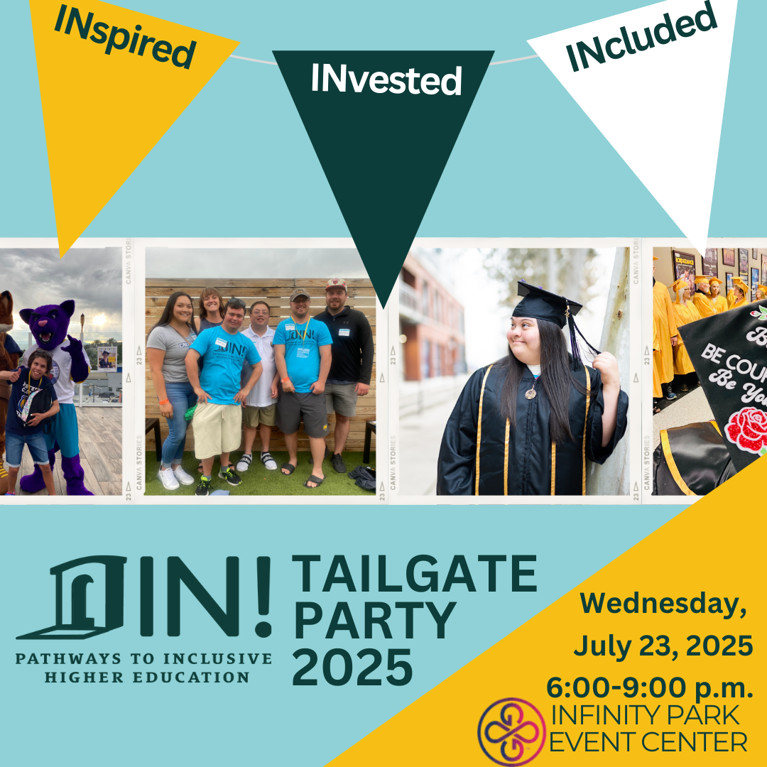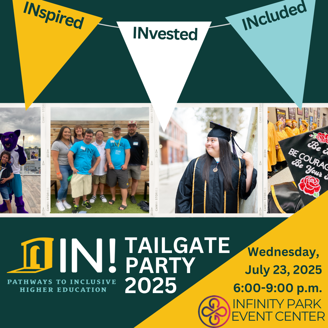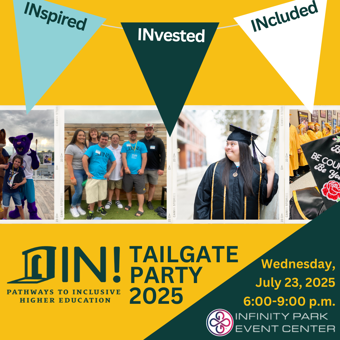 YOU can support IN!'s efforts at the Tailgate Party! This premier fundraising event brings the community, students, school partners, and businesses together to celebrate inclusive higher education! Together we will raise funds that open the door and establish pathways to inclusive higher education for students with intellectual disability statewide. Learn more at https://inclusivehighered.ejoinme.org/2025Tailgate