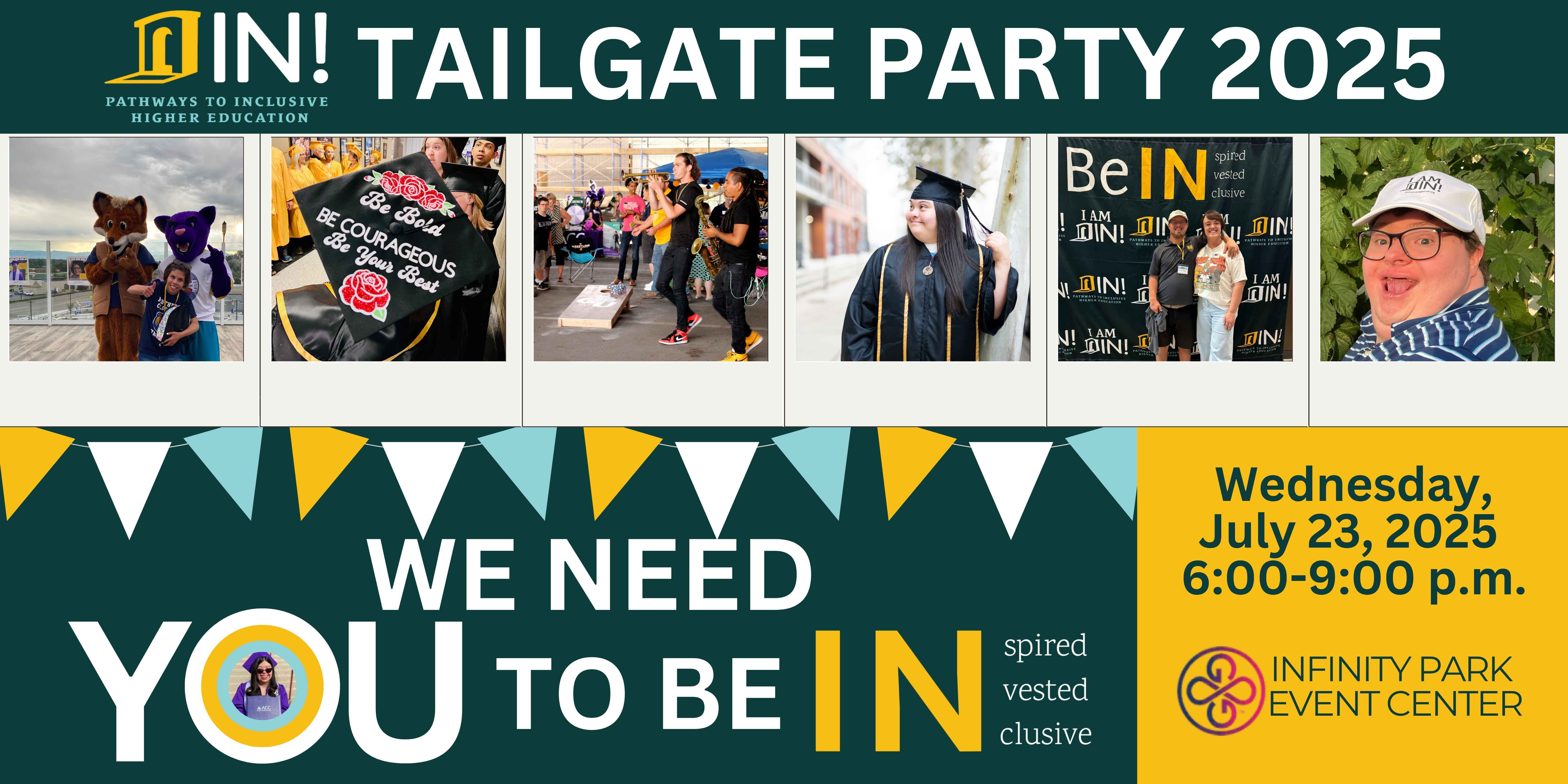 IN!'s Tailgate is fun. It's inspiring. This year, IN! needs your support to make it even more impactful! Due to the recent loss of state funding, our community needs to be IN! now more than ever. Join IN! to celebrate the power of inclusive higher education in Colorado and ensure it continues for hundreds of more students with intellectual disability. Are you IN!? Buy your tickets at https://inclusivehighered.ejoinme.org/2025tailgate